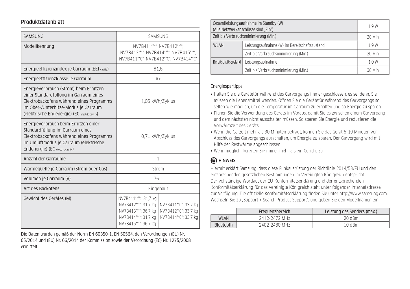 Energieeffizienzklassen und Spektren: Backöfen, Herde und Dunstabzuge A+++ - D. Geschirrspuler und Kuhl-/Gefrierschränke A - G und Leuchtmittel A++ - E.