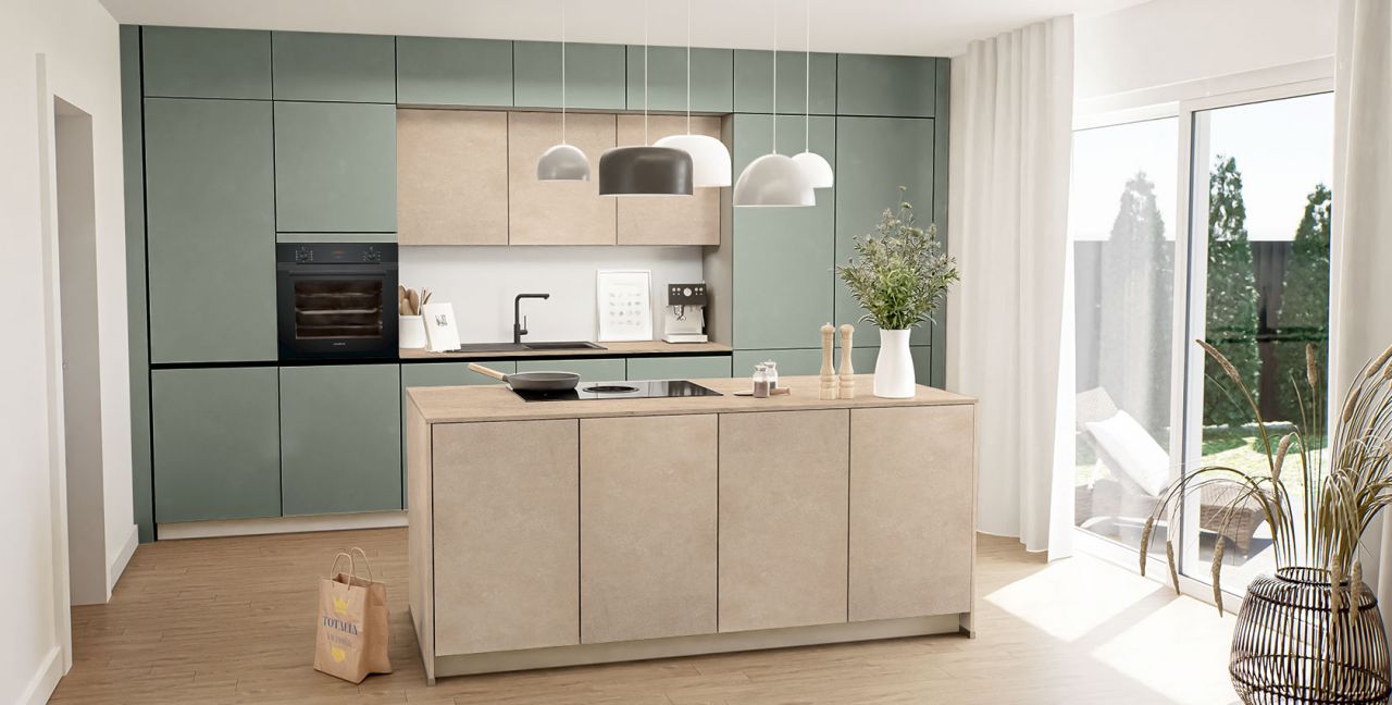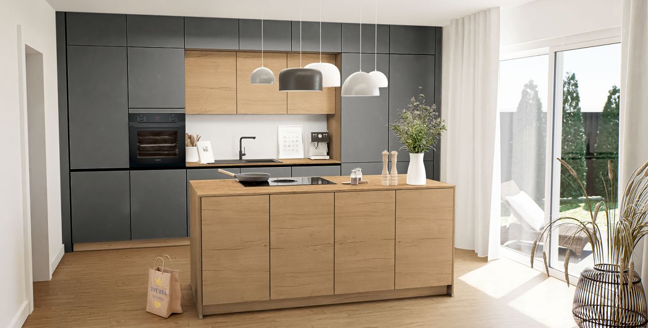 Inklusive Einbaubackofen schwarz Siemens HB234ABB3 Energieeffizienzklasse A+, Glaskeramik Kochfeld mit Induktion und Kochfeldabzug (Umluft) Bora GP4U, Kühlschrank Laurus LKG88E Energieeffizienzklasse E, Einbau-Designspüle Elleci Logik 300, XL-Schränken, Wandschränken mit Klappe